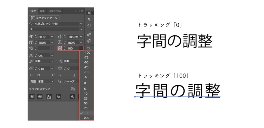 Illustratorで字間を調整するときは、「トラッキング」と「カーニング」を使います。