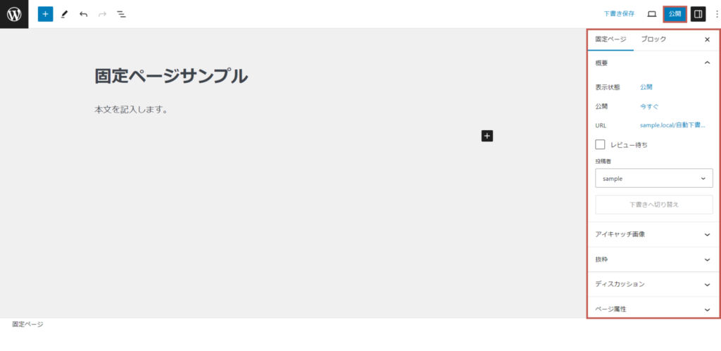 最後に右上の「公開」をクリックして固定ページを生成します。