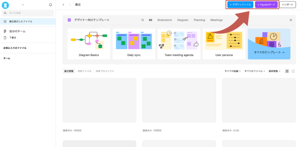 そして、水色が「Figmaデザイン」、紫色が「FigJam」の新規ファイル作成ボタンとなります。