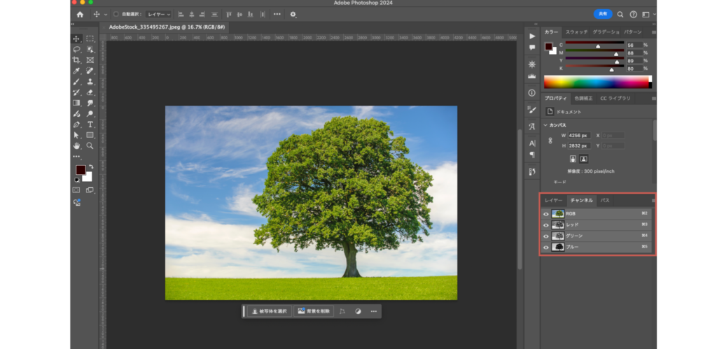 チャンネルパネルを表示し、「RGB」、「レッド」、「グリーン」、「ブルー」のチャンネルが表示されていることを確認します。