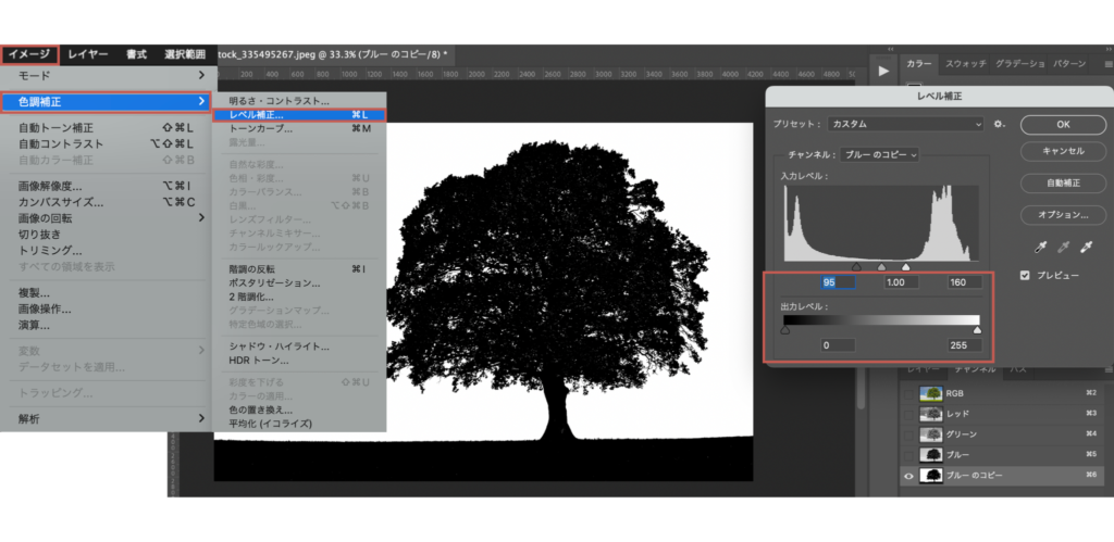 次に、作成したアルファチャンネルを選択した状態で、「イメージ」メニューから「色調補正」→「レベル補正」(Command+L)を使い、コントラストをさらに強調して調整します。